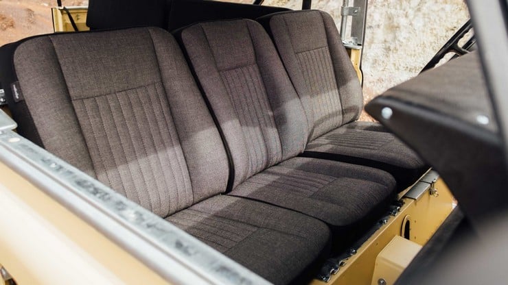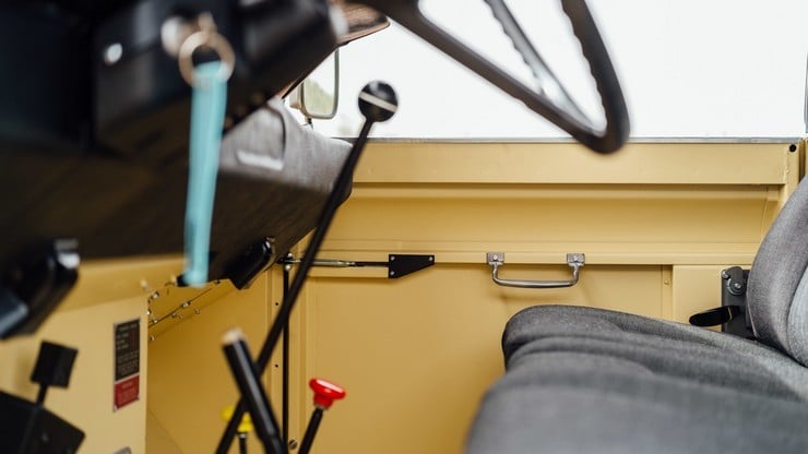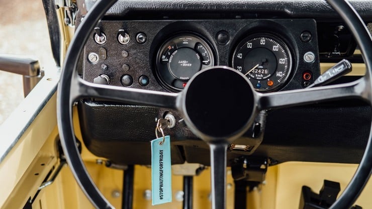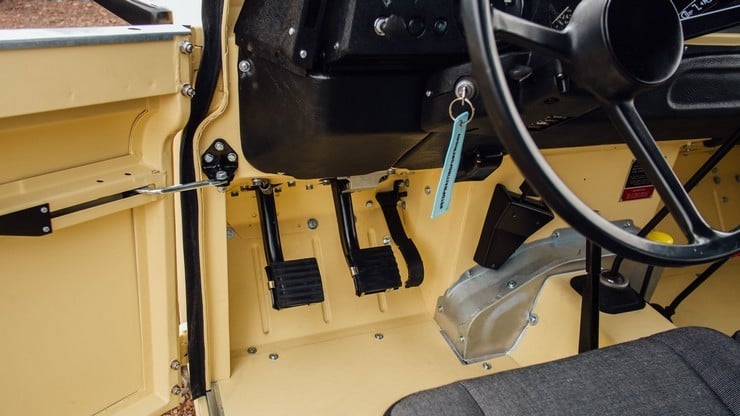 The box-section chassis is original as are the axles and 2.25 liter diesel engine. The vehicle also sports water & UV-resistant seats, a custom black mohair hood, heavy duty wheels, new BF Goodrich mud tires, and military style windows. Finished in Light Matte Yellow, this superb Rover has only 19.000 miles from new, which means it can still take many trips to the beach. [via]