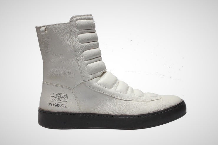 The Po-Zu x Star Wars Shoes ($TBA) consists of Poe Dameron’s mid-calf chrome-free leather boots in either chocolate brown or black.  Finn’s boots come in three colorways; one in white to represent FN-2187’s stormtrooper origin, distressed metallic bronze leather to represent his flight to freedom, and black, just in case the Dark Side is calling you.