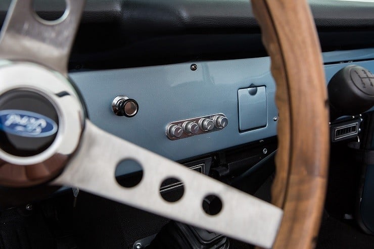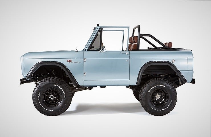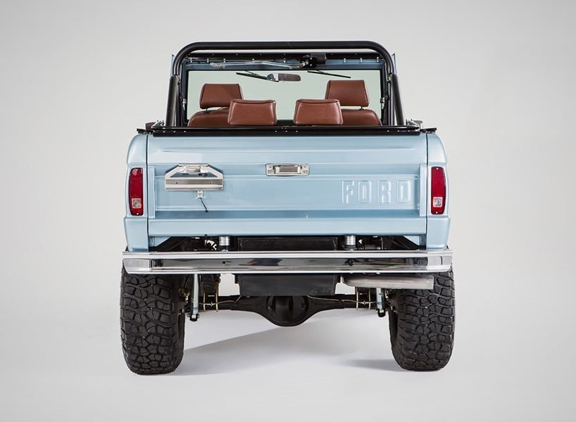 If you’re wondering about the delicious looking blue paint, it’s called ‘Brittany’ and was chosen to compliment the brown leather seats inside. More Brittany Blue can be found around the dashboard. Under the removable soft-top, the black framework of the roll cage balances the BF Goodrich mud terrain tires. With a high ground clearance, this Bronco is ready to race anywhere with the herd. Hear how she roars in the video below