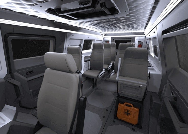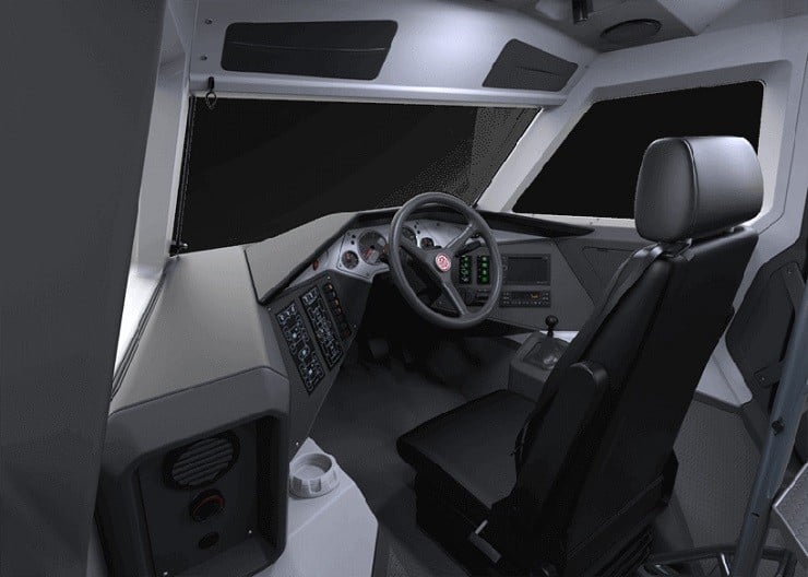 The Shaman is reported to be easy to drive even though you have to get used to the cockpit placing the drive seat in the center of the vehicle with passenger seats behind. It features three drive modes; On-Road with front 4-wheel drive, Off-Road provides active rear-wheel steering, and the Crab Mode that places all eight wheels in sync. The 146 horsepower F1C 3.0 liter Iveco turbo diesel engine is matched to a six-speed manual gearbox. The Avtoros Shaman can pull 45 degree slopes with ease and haul up to a ton and a half of cargo.
