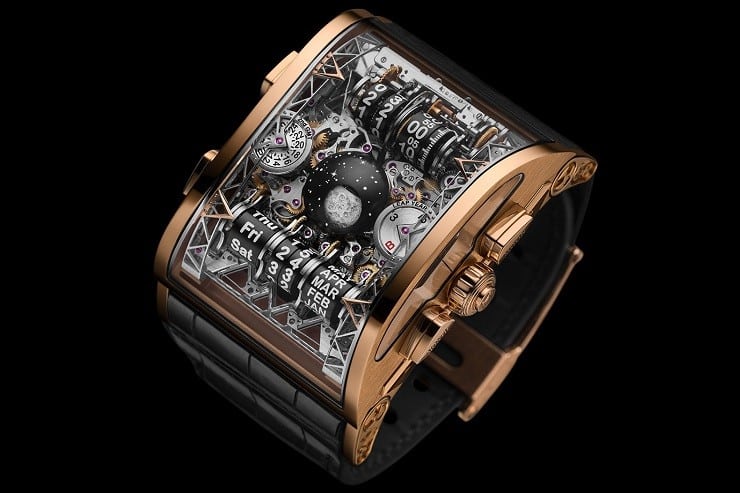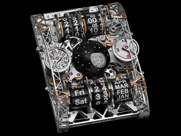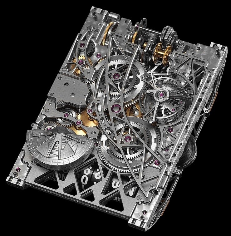 The new Hysek Colossal Grande Complication Watch (~$700K) has pulled off some near-impossible feats among its multiple, and occasionally patented mechanical complications.  The use of a circular time display to give a 24-hour digital-looking readout has a special ‘jumping’ feature to correctly show Midnight as well as vertical gears to produce linear displays.  For even more mechanical awesomeness, the Date also displays from rolling cylinders.