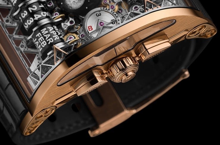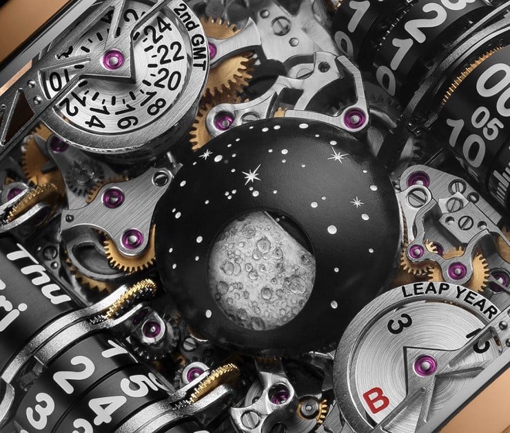 Another first is the domed Moon Phase complication which rotates the dome on ceramic bearings to show the phases.  There is a power reserve complication, as well as seasonal day-night indicators, a GMT dual time zone display, a leap indicator, and other features all contained within the 18K, rose gold case, that is more a framework to showcase the movements both front and back.