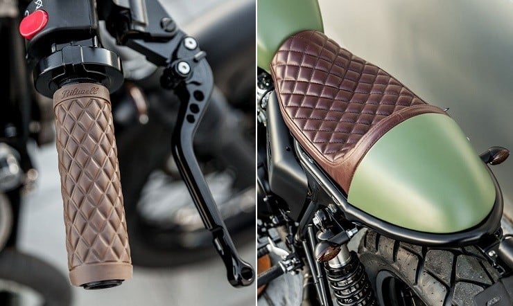 A fabulous example of this dedication to classic form in a bespoke build is this 2007 Triumph they call the ‘Lady Speed’ ($NA).  Beginning with a customized fiberglass tail section, the Spanish fellas completely restructured the sub-frame before adding the leather saddle mount.  Other changes included the relocated ignition, the Bates-style yellow head light, and the Biltwell thruster grips.  Hagon progressive springs were coupled with new Nitro shocks to give the Triumph ‘Lady Speed’ a much more stable ride.