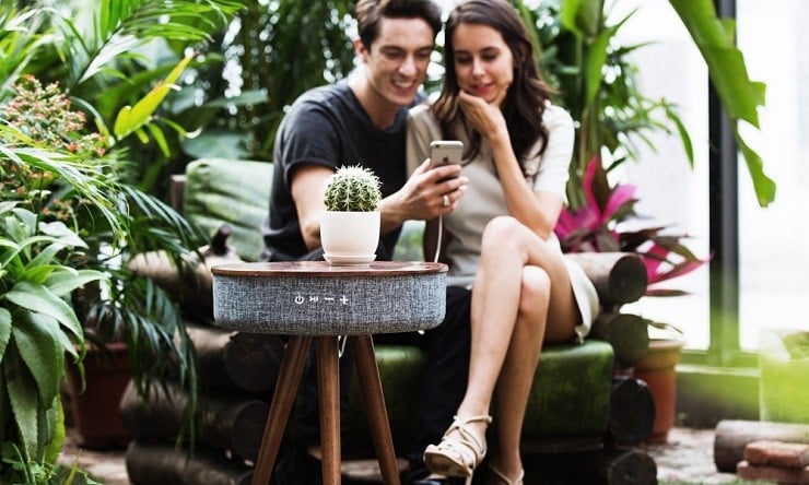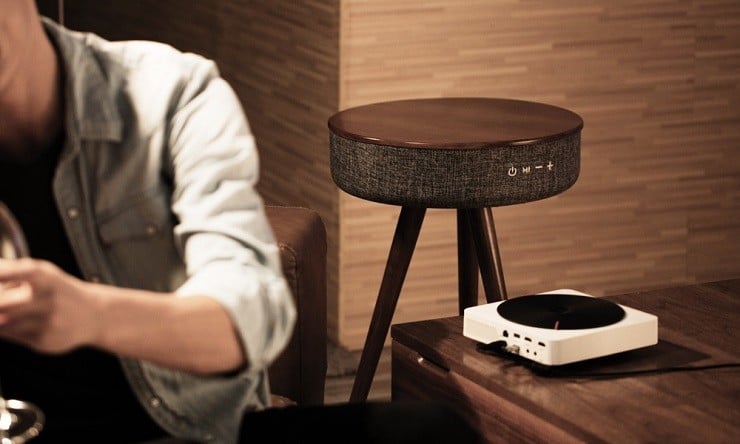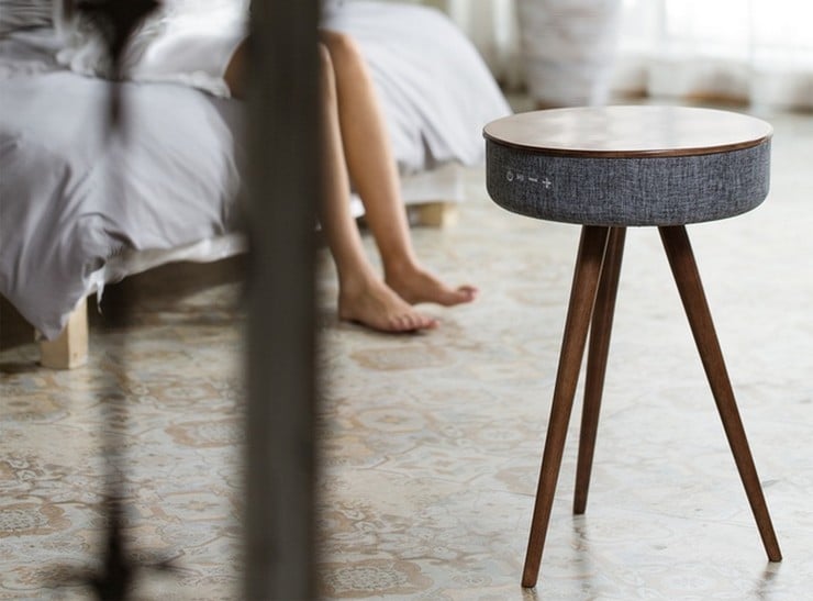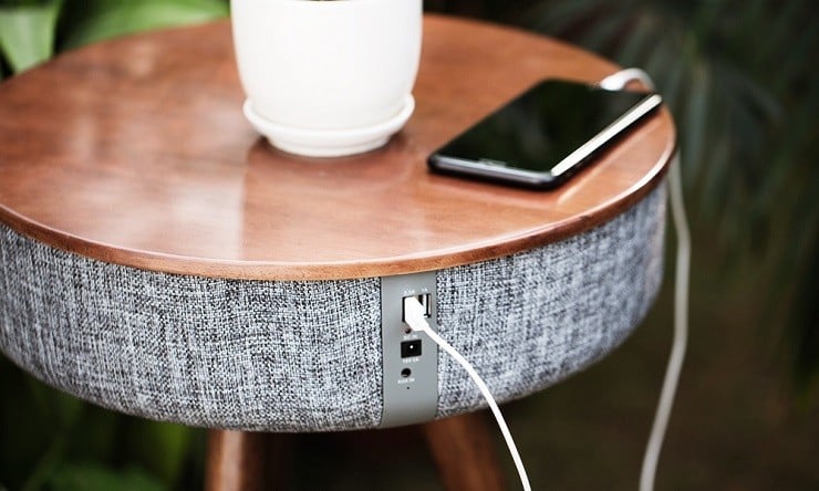 This simple, cleanly designed piece of furniture fits into any decor. It has a classic three-legged design and top crafted from beechwood. But that only begins to describe this table. Under the top, woven micro-fabric hides the technology to run four Bluetooth 4.2 speakers capable of picking up from 33 feet. The interactive control buttons are sewn directly into the fabric on the side where you can turn it on and off, play, pause, or answer the phone, and to control the volume up and down. It also features two USB ports for handy and convenient charging of your smaller devices.