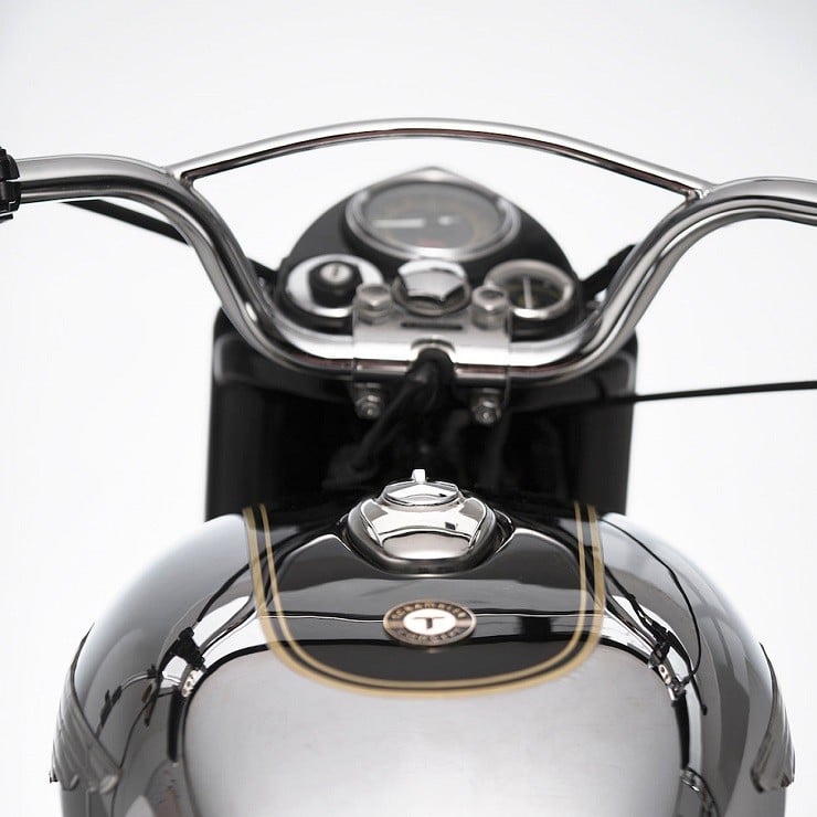 They decided to take the long-wheelbased, long-distance roadster and turn it into a scrambler style bike that would be more at home in the city.  Wanting to keep as much original bike as possible, they took the stock tank and shrank it.  This was also done to the side boxes before giving what would end up being called the ‘Moltar’ a new stainless steel exhaust system.  As well as reworking the subframe, the ‘Moltar’ was given an oxblood leather seat and a minuscule ducktail to balance the look when ridden.