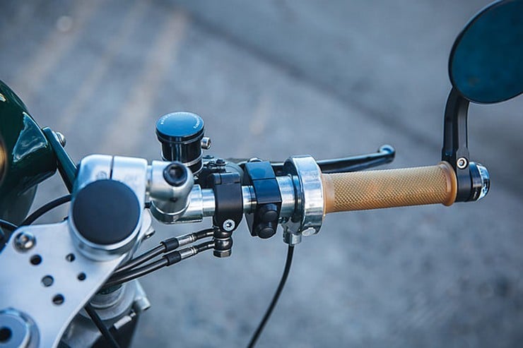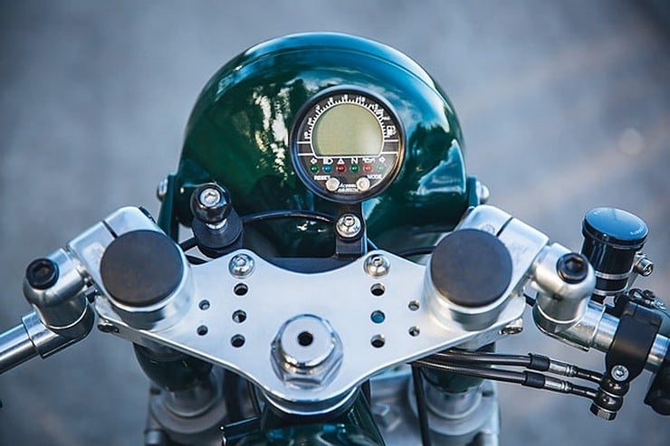 The frame was narrowed and a custom rear hoop was built. The tank also got the thinning treatment and a flip-style gas cap. A Boxer Metal big-brake kit was installed along with custom fork springs, while a custom stainless steel 2 into 2 gas removal system was also fitted. Motogadget electronics were chosen to run the Euro Moto Electrical setup, speedo, and new LED lighting.