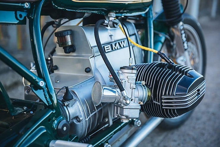 The problem of creating a bike for touring that could also carry luggage was solved by making two separate seats that can be switched out along wit quick-release saddlebag mounts. The sleek ride was then topped off with a British Racing Green paint job for a final touch of class.