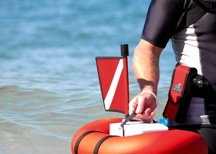 AirBuddy utilizes a rechargeable 12-volt battery to power the air compressor and is an easily transported 21 pounds in weight. The dive range gives 45 minutes of air down to 40 feet of depth. Safety features include an emergency 15-liter backup air reservoir and audible low battery power signal. With a bright red flotation section and dive flag, the device easily shows your presence to passing boaters, while a detachable magnetic wristband offers the diver the on/off switch.