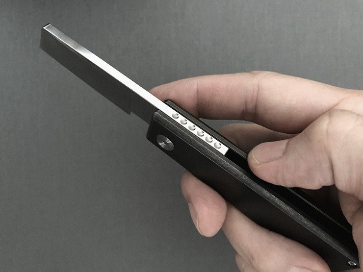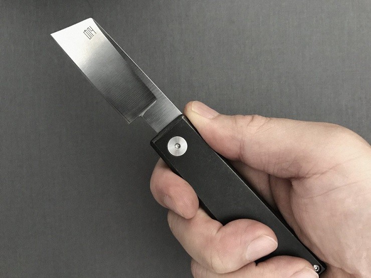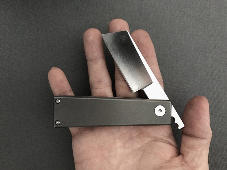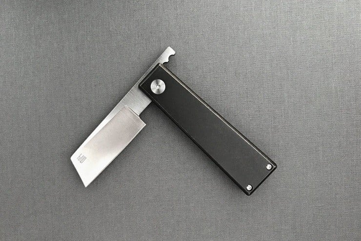 Looking like a somewhat truncated straight razor, Jho Knives’ latest offering embraces the square lines and simple friction-free opening of the old-time shaving instruments. The classy GS1, the “Gentleman Slasher”($260) is all straight lines and sharp angles.
