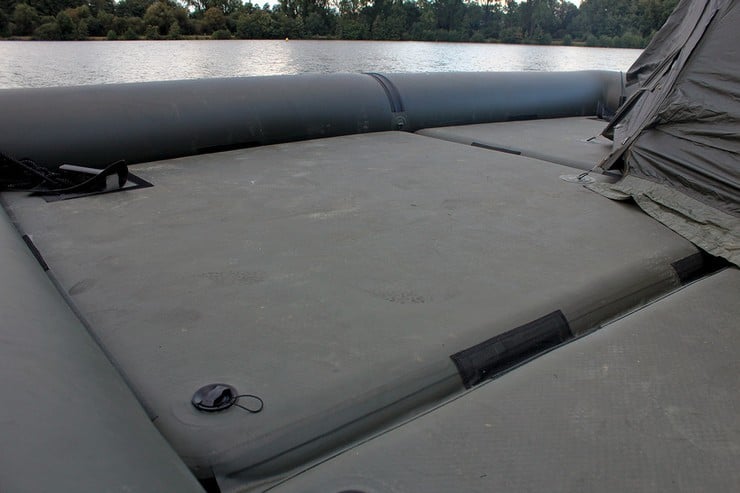 Constructed of durable five layers of 1100 Decitex PVC with four air decks with anti-slip material on top, the platform has an additional 20″ in diameter tube that acts as a bulwark around the 150 square feet of deck area. There are eight discrete air chambers as a safety feature against sinking and a repair kit is also included for emergencies.