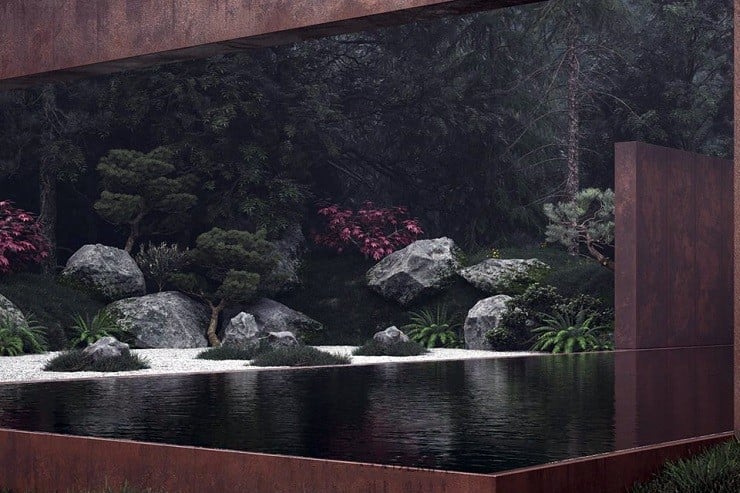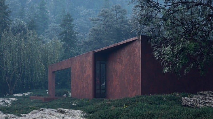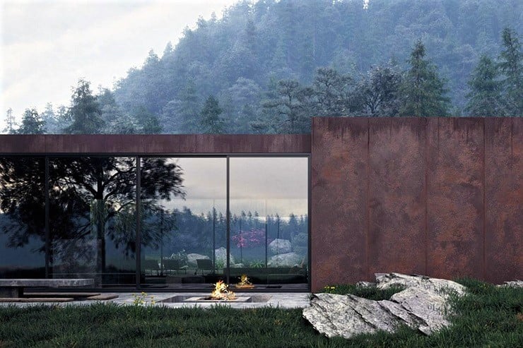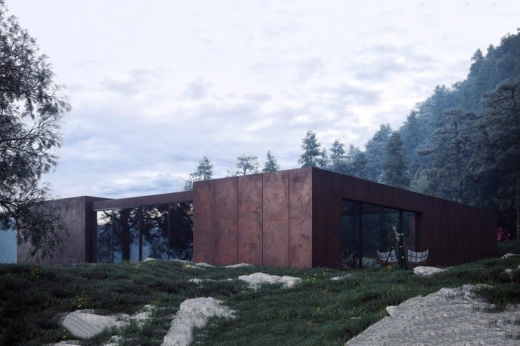 With its angular shapes and deep red color of the weatheing steel walls, the ‘Rose House‘ lends a sense of monolithic beauty that blends in perfectly with the wild surrounding terrain.