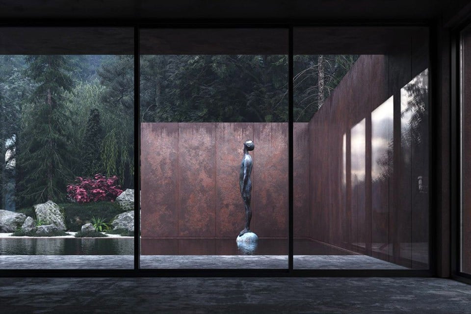 The pool with its statue of a human welcoming the rain defines the space and holds the key to realizing it is 3-D artistry. Inside its anchor-solid walls that will change patinas over the years, the relaxing simplicity of the Rose House’s design soothes on many levels.