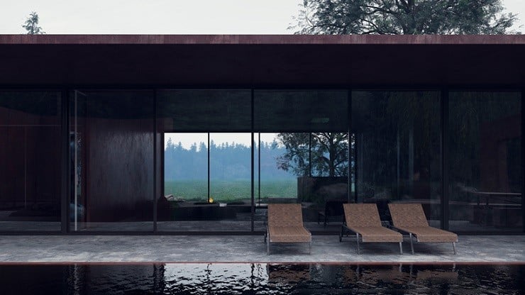 Perched atop the picturesque Carpathian mountains of Ukraine, the construction remained minimalistic – it is primarily a blend of concrete, glass, steel, and water pools to form this unilinear mountain castle. The house focuses attention on nature, featuring large floor-to-ceiling windows that illuminate the open-layout interior.
