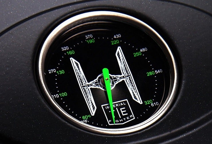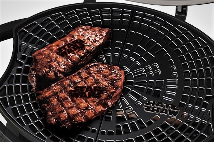 The grill comes with a custom TIE Fighter analog thermometer to monitor your feast and uses an Electric Pulse Ignition to get it going.  As you can imagine, the TIE Fighter grill is black.  It comes with a 25-year limited warranty which is a much better deal than the Empire got on its starfighters.