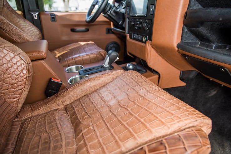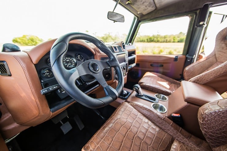 Inside, the Huntress has such modern conveniences as Apple Car Play with custom Morel speakers and a Kenwood touchscreen infotainment center complete with GPS.  It also features integrated WiFi, air conditioning, and a backup camera.  But what makes the Huntress so unique are the locally sourced chocolate-brown alligator skin Corbeau bucket seats, which will develop a beautiful patina over time, during adventures and a lot of tough use.