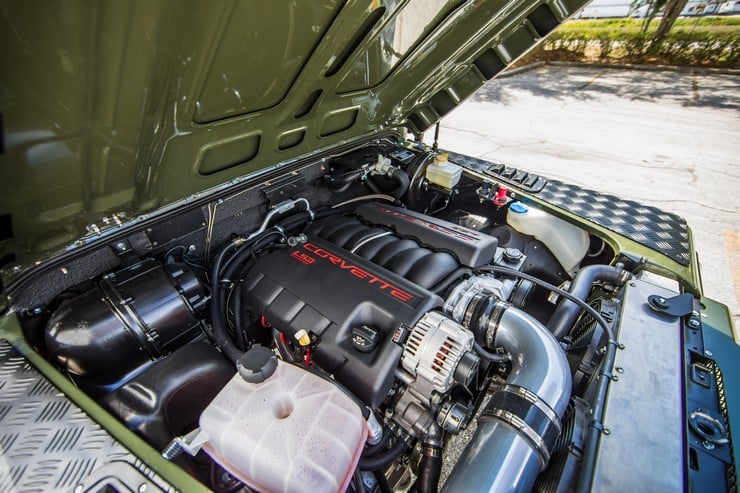 The Huntress was given a 6.2 liter, 430 horsepower Chevrolet Corvette LS3 V-8 engine and paired it to a 6-speed automatic transmission; all of which makes the 0 to 60 test in just 6.5 seconds.  The body has been given a 2″ lift kit over 18″ Boost wheels for a very aggressive look.  The WARN winch up front makes this Land Rover Defender ready to face any environment.