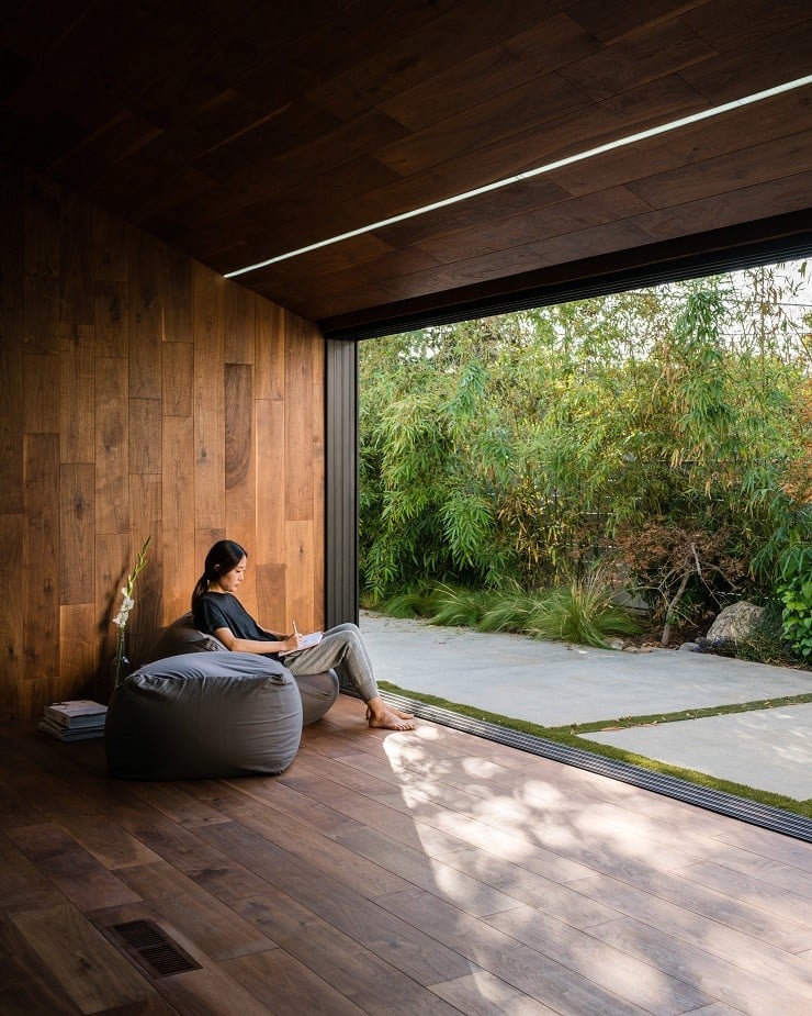 Project Hide Out is located in the Osaka neighborhood of Los Angeles, California and takes on the Japanese style with its wooden box volume that provides open meditation space while framing the enclosed garden space.  A massive skylight helps provide unfettered daylight into the nearly gutted first-floor display gallery and studio.