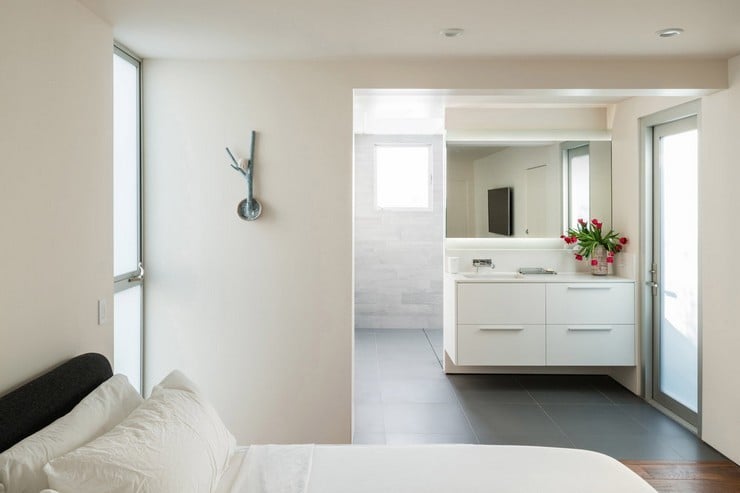 The minimalist design extends even to the small multipurpose room revealed by a floor-to-ceiling pivoting wall.  The heavy handcrafted walnut staircase that leads up to the second-floor bedrooms anchors this otherwise airily open structure and offers a contrast to the play of light across the muted wood tones.