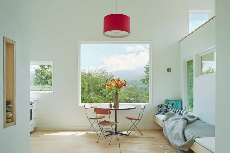 Working with a total footprint of only 430 square feet, the Micro House succeeded in containing a sleeping loft, kitchen, bathroom with tub, utility table for eating and working, a living area, storage cabinets, and laundry room/equipment storage.  To eliminate the cube look, two corners were inset, one to produce an entrance porch and the other defining the sleeping loft.  The light colored walls are defined with horizontal and vertical window shapes that also add to the home’s beauty by framing the surrounding scenery which includes a spectacular view of Green Mountain’s Camel’s Hump peak.