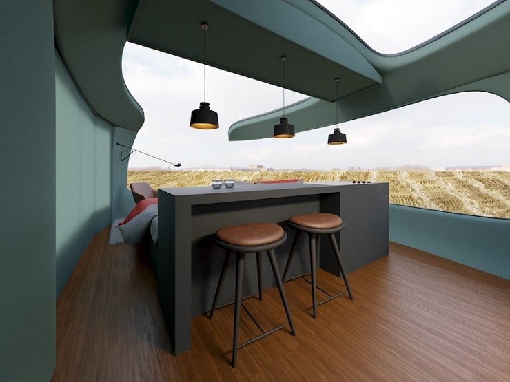 The pod, like the car, is compact and well rounded. Inside there is a large living area behind a huge wraparound window for full enjoyment of the vistas outside. This surprisingly spacious area quickly converts to a bedroom at night. It contains a fully functional kitchen and bathroom inside its pill-shaped form. Skylights over the living area and kitchen assure that illumination is never a problem.