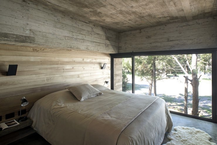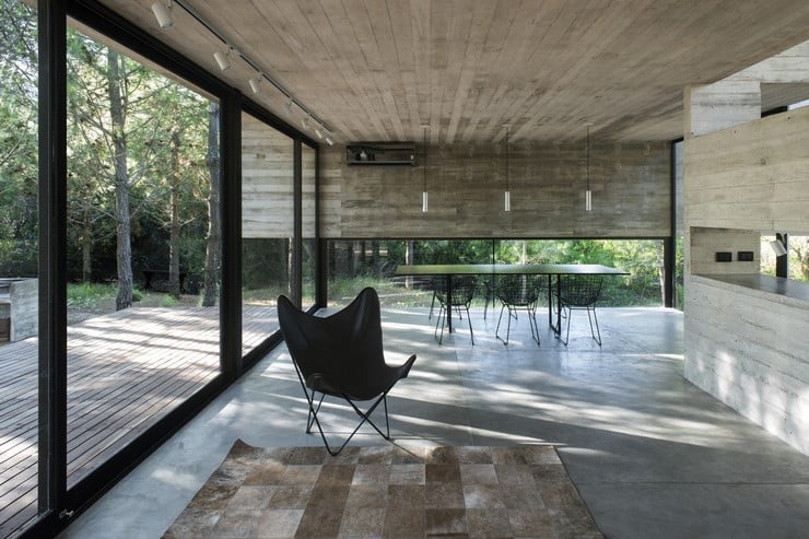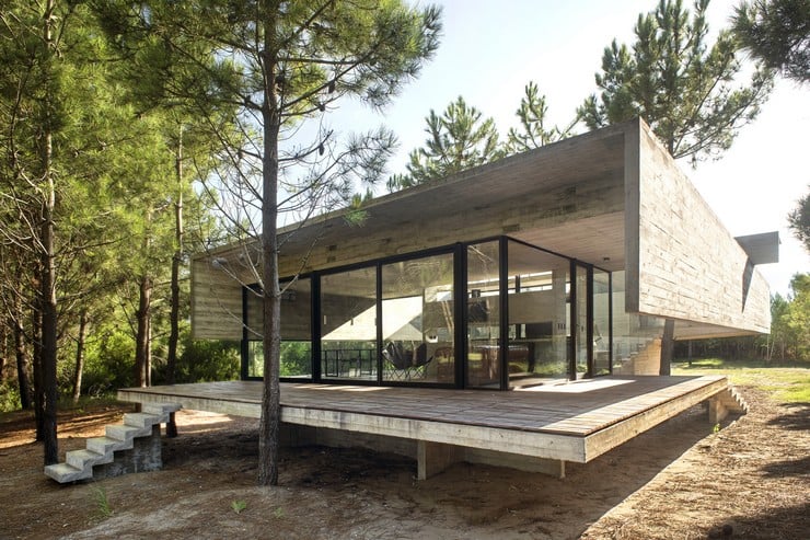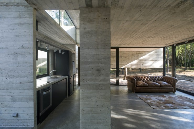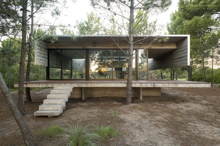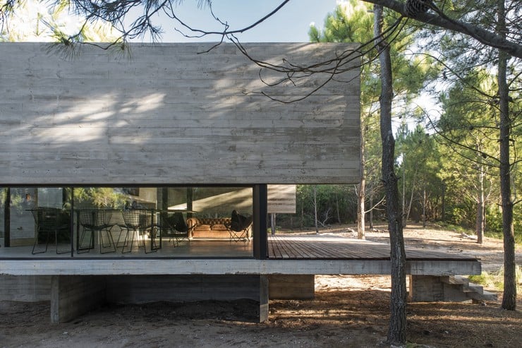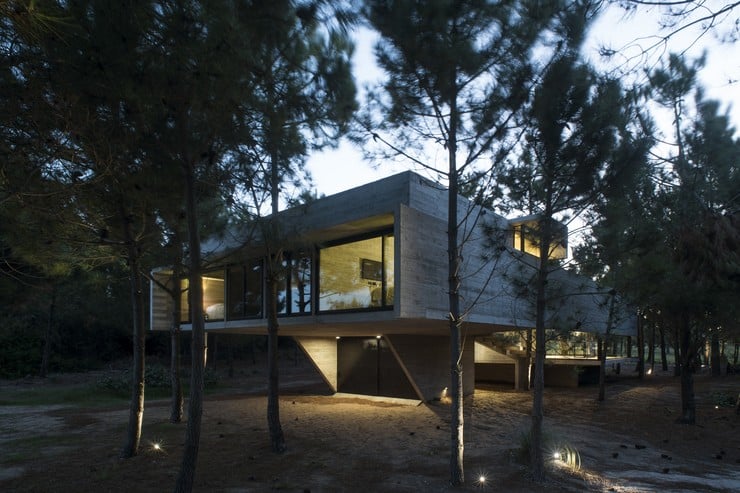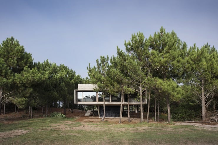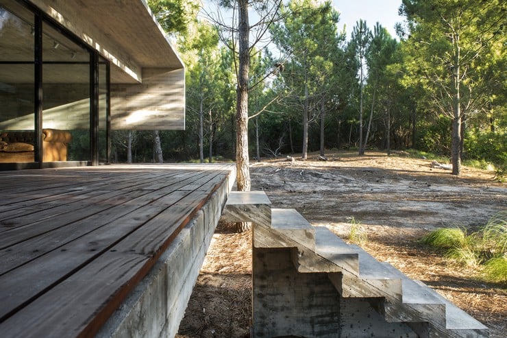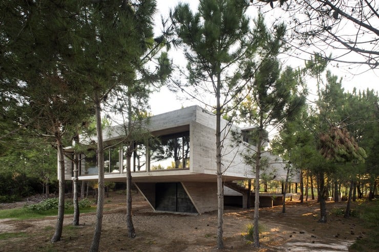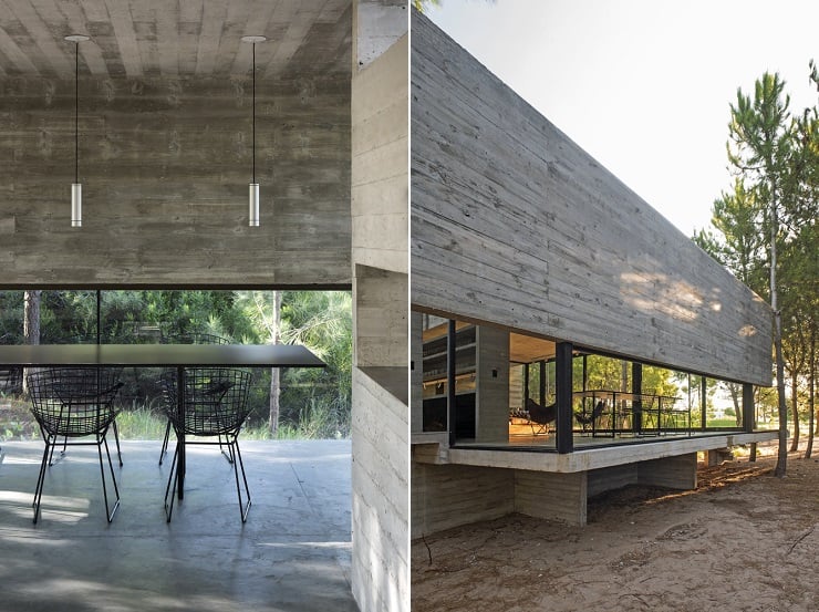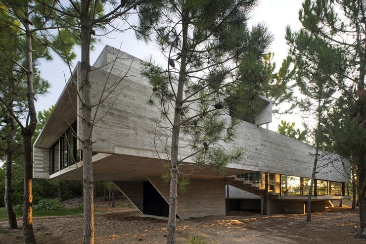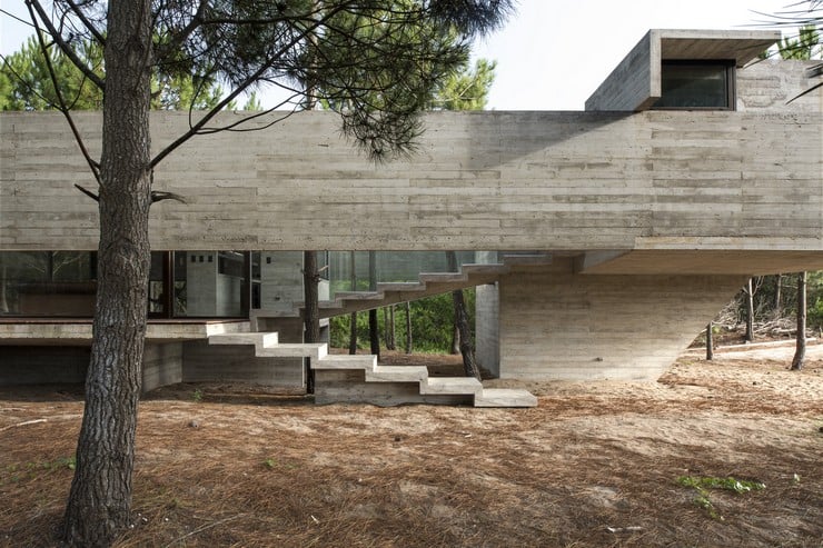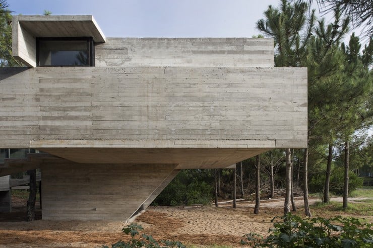 At first glance, the S+J House outside the city of Pinamar in the Buenos Aires Province of Argentina appears to be a rather plain and simple structure. Designed as a two-family house, it consists of two platform units connected by shallow stepped bridges. It is constructed almost exclusively of exposed concrete defined by dark bronze anodized aluminum trim and a continuum stripe of concrete surrounding both platform parts to give a single volume look.