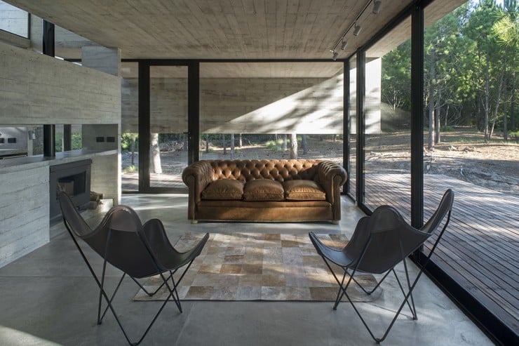 The ground it sits on is slightly sloped so that the rear end with the bedrooms appears to float above the ground. The builders were charged with removing only enough of the lot’s pine trees to insert the house so it is blended with the surrounding pine forest. The supporting columns are kept small so as to leave as tiny a footprint as possible and allow for a parking area below the promenade deck. A golfer’s delight, the social area of the house overlooks a golf course situated on the next door plot. A design by the extra talented Luciano Kruk.