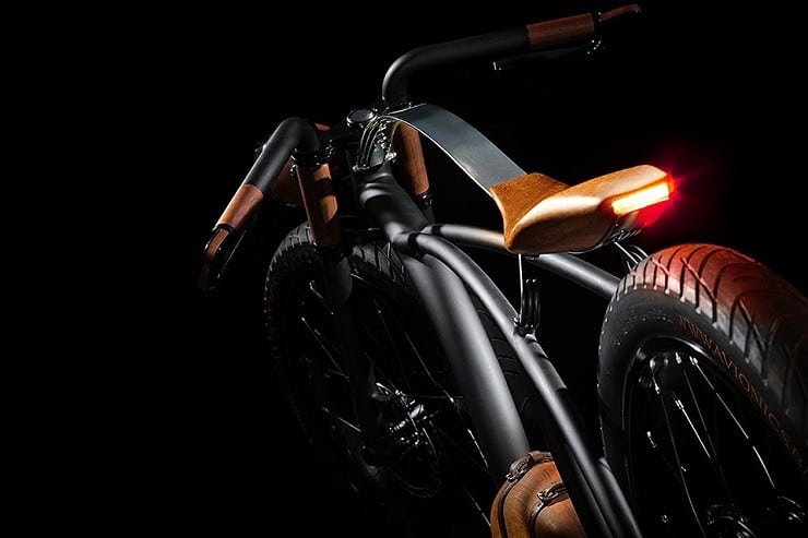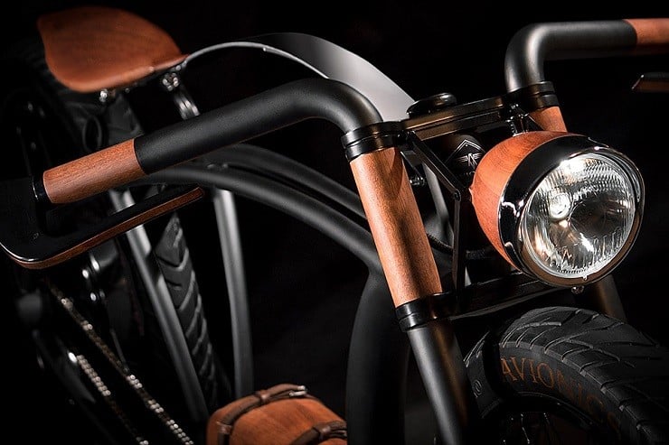 Rather than just adding an electric motor to an average bike, Avionics has designed the V1 to be a unique experience. Accenting the deep matte black steel frame, the battery pack, saddle, grips, headlight enclosure, and part of the front forks are made of Jatoba wood – a beautiful and exceptionally stiff, strong material.