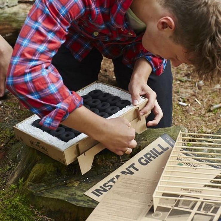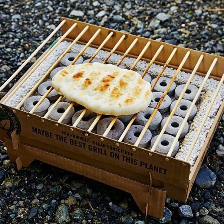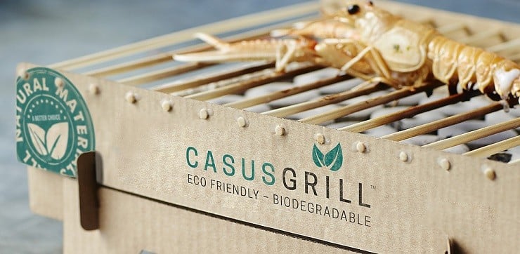 The body of this one-use grill is constructed of Forest Stewardship Council-certified cardboard that has been lined with lava stone chips. It has a grilling rack made of untreated bamboo sticks and is preloaded with bamboo charcoal briquettes. The CasusGrill is easy to light and, unlike conventional charcoal grills, comes up to cooking temperature in as little as five minutes and can retain that level of heat for an hour. The preloaded donut shaped briquettes assure an even heat across the entirety of the grill for better food preparation and emits about 50% less CO2 than traditional grills. The lava stone liner prevents downward heat emissions and can even be held in your hands.