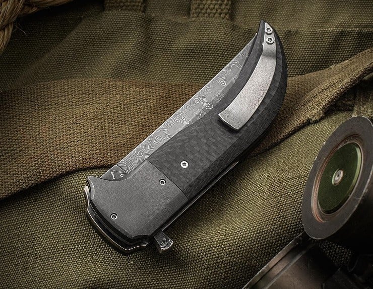 The knife has a 3.7″ upswept blade made of stainless Blackout Damascus steel, as well as an orange peel titanium pocket clip, and a Zirconium backspacer. The overall length of the knife is 8.125″ with the handle being a contoured carbon fiber construction with orange peel bolsters. The matching liner is titanium and its movement is the exclusive McClure Jeweled Pivot.