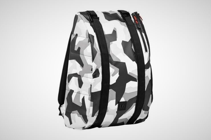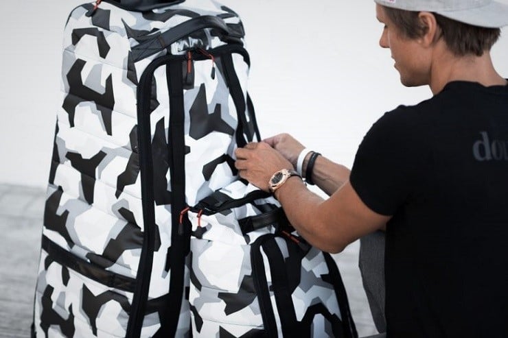 The Douchebags Camo Collection ($124+) features a unique monochromatic pattern designed by Olsson himself.  All bags sport a tough, water-resistant polyester construction with strong zippers and rib cage padding.  The smallest, the Base 15L is a side-loading backpack that includes special pockets for a 15″ laptop and iPhone.  The Hugger 30L is a full-sized carry-on approved backpack with side ribs, top access, internal mesh security pocket, and separate laptop pocket.  The Big Bastard 90L is a massive rolling bag that is designed to get all your gear to base camp, and The Douchebag, a full-length, adjustable snowboard bag with wheels which will roll up for storage while you are on the slopes.