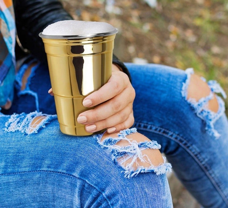Made of stainless steel with a glossy electroplated gold-tone finish, the sturdy, reusable cup holds 16oz.  Just like the original, the container is stackable, gets cold quicker and retains cold longer than plastic.  It also needs to be hand-washed after use but that is a small price to pay for such a noteworthy addition to your party.  Also available in copper and in an iridescent rainbow finish.[via]