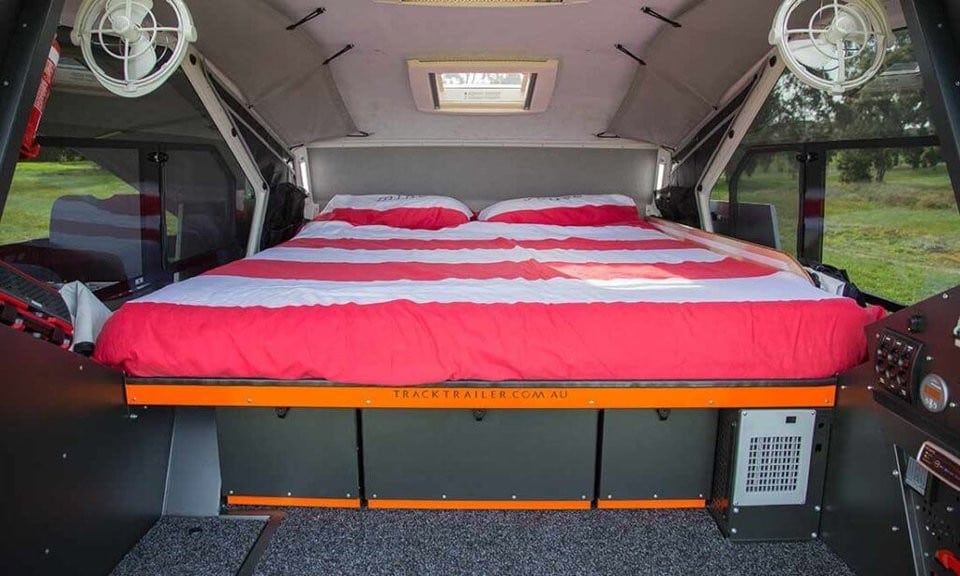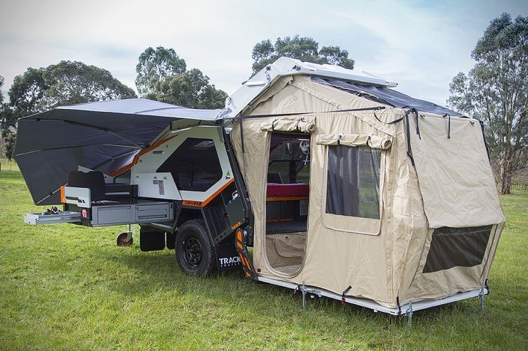 Lighter than previous models, while still providing improved stability in off-road conditions, the Mk5 features a cloth-lined hard shell housing a queen-sized mattress/bed with a large storage area under it.  Large tinted windows with magnetized curtains allow for plenty of daylight to protrude while offering privacy at night.  There is also more headroom inside and a rear deck with integrated support, plus an expanding tent with a hard floor.  Since the tent folds up into the hatch there is never any wet or dirty canvas on the bed which stays ready for use and dry.  The trailer also provides a free standing, one-person setup awning that takes only two minutes to be in place.