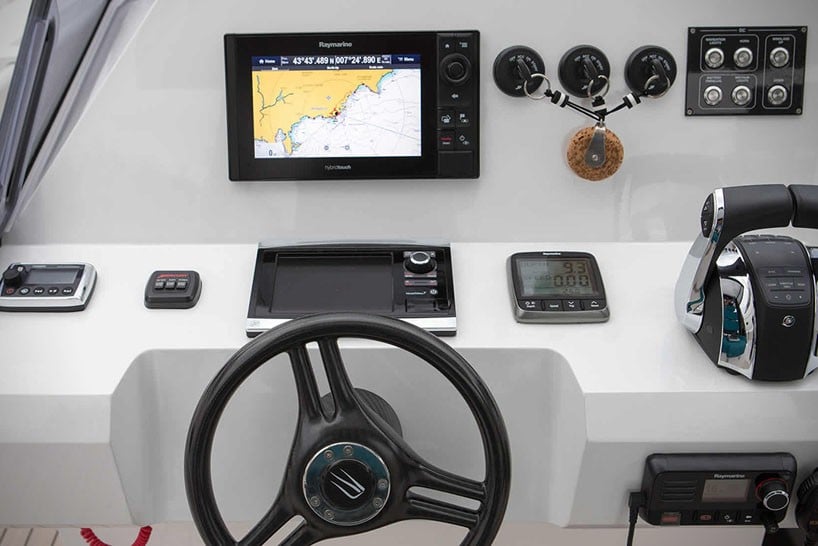 This sleek white craft is 45′ long with a 13’ beam and a draft of barely over 2-1/2 feet. Along with its 63-gallon onboard water supply, the Tender X has the capacity for 396 gallons of fuel to feed the engines. It provides a range of over 400 miles at half speed (35 mph) and can handle winds up to 46 mph easily. As expected, the cockpit has all the newest navigational instrumentation. [via]