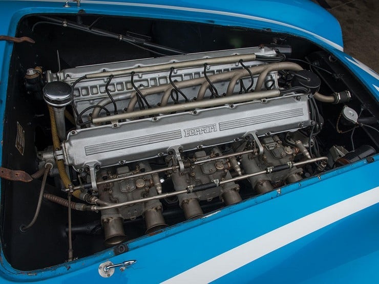 The six cylinder engines were new to Ferrari at the time and with its three side-draft Weber carburetors it provided the speed they were looking for. From its first race, the 1955 Mille Miglia, this dynamo kept burning up track after track until the Del Monty Trophy Race at Pebble Beach in April of 1956 when its driver, Ernie McAfee lost control and died as it hit a tree directly in the driver-side door. Over the next few years this 1955 Ferrari 121 LM Spider was restored; losing its traditional chassis stamping but retaining the original matching numbers engine and gearbox.