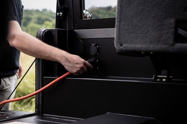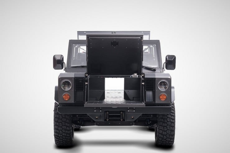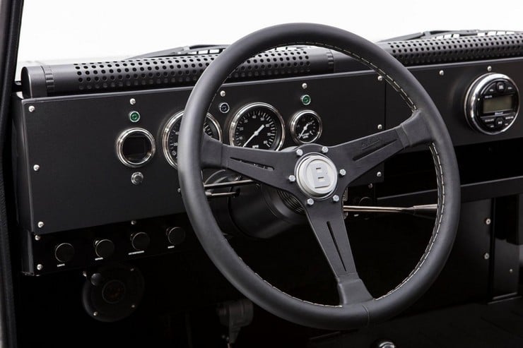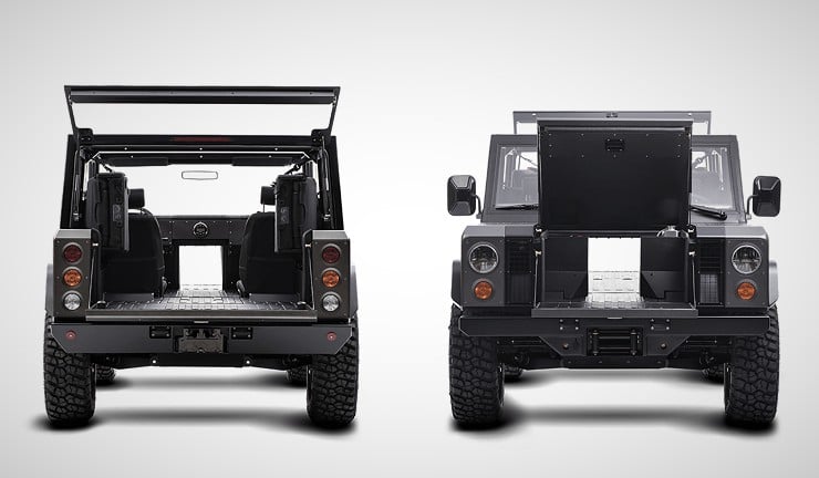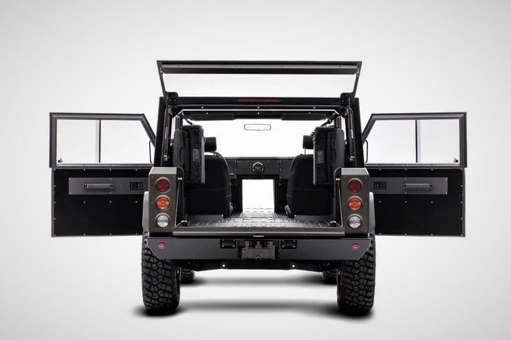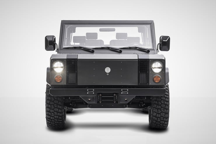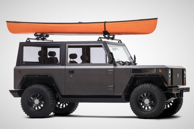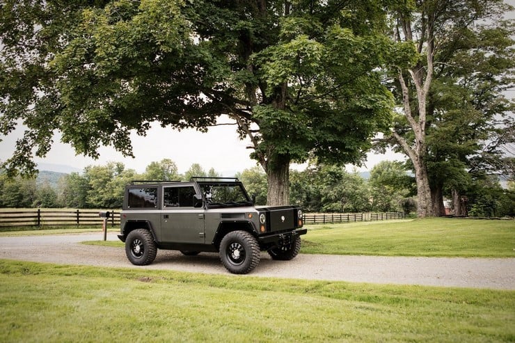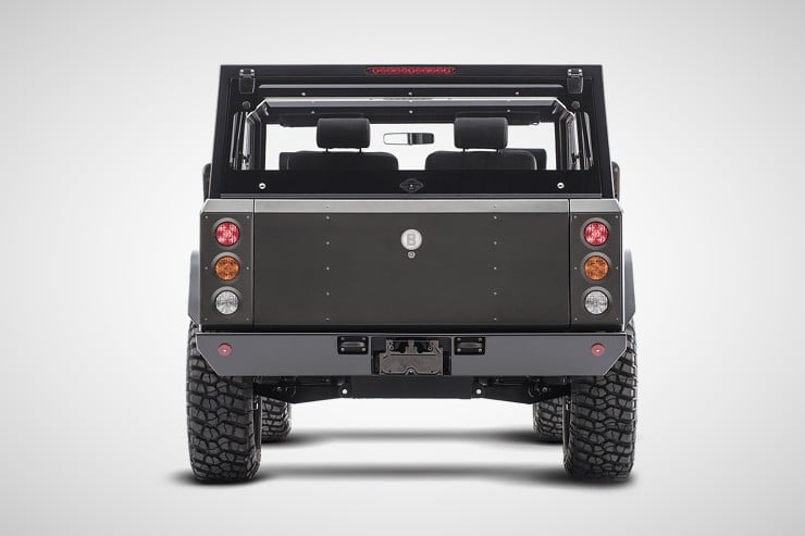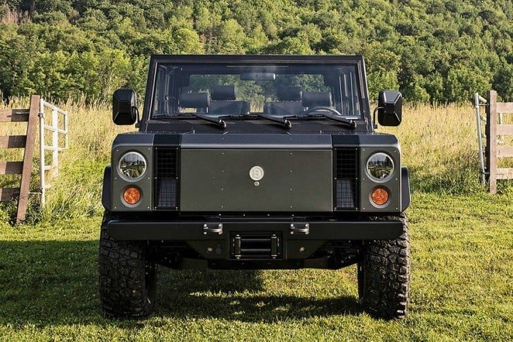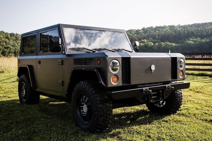 The juice comes from a 100 kWh lithium-ion battery pack driving the four wheel-mounted motors with 360 hp, 472 lb-ft of torque power, an impressive 0-60 mph in just 4.5 seconds, and a top speed of 127 mph!  It is designed to give about a 200-mile range per charge.  Bollinger has kept the design clean & classic on this electric bad boy, complemented by the ‘gunhouse’ grey paint with black accents and the black leather interior.