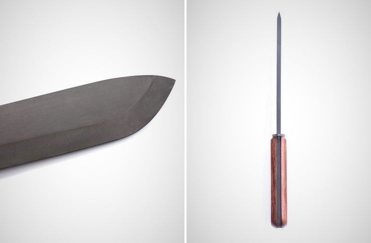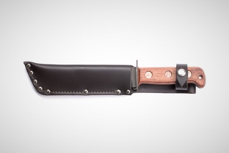 This survival knife has many more uses than just fighting. While it was designed for the military, the hefty blade can be used for slicing, carving, or chopping and can retain its edge through heavy use. It comes with a brown leather sheath that has been both stitched and riveted for extra strength and will fit up to a 4″ belt. The wooden handle has been stamped with the military contract number and its NATO identification number – sign of authenticity of a serious knife. [via]