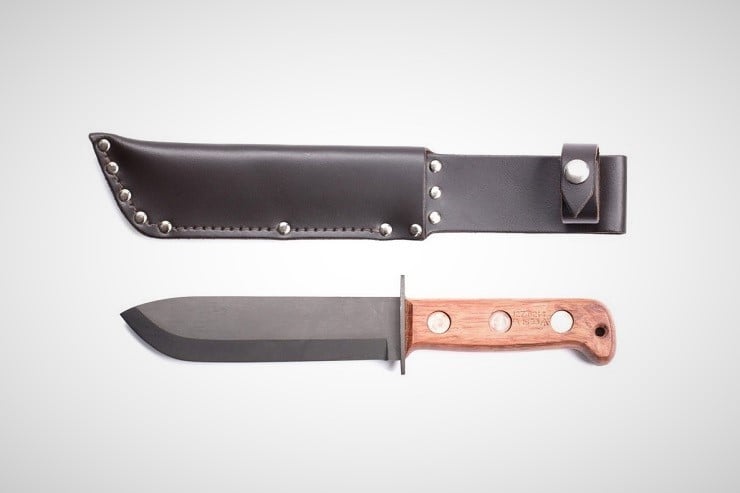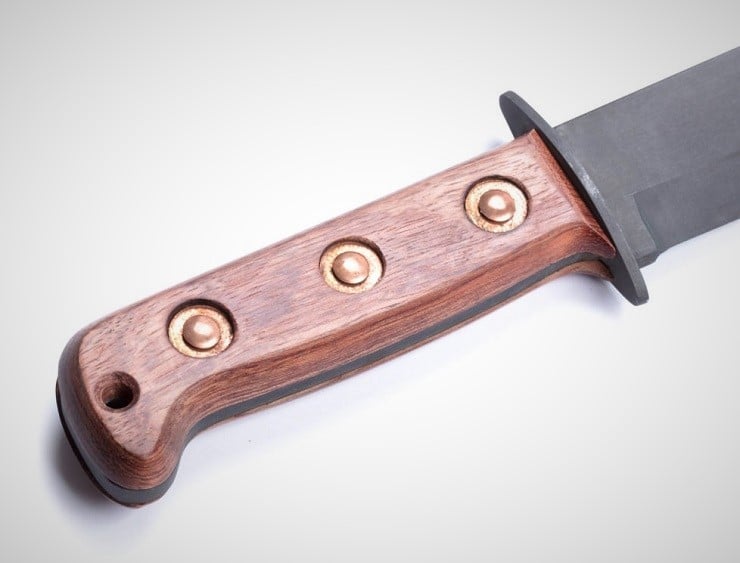Made by England’s Sheffield Knives, the M.O.D. is a fixed-blade, drop-point design with a total length of 12″. The 7″ blade is made of high-carbon steel, 4mm wide, and given a corrosion-resistant phosphate coating. It is attached to the natural Bubinga wood handle by three rust-proof copper rivets.