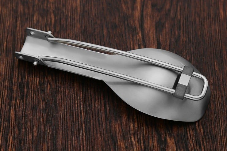The Esbit Folding Titanium Cutlery ($15 each) features a long-tined fork, deep bowl spoon, and serrated edge knife completely formed of ultra lightweight, non-magnetic, hypoallergenic, corrosion-resistant titanium. Each piece folds in half for more compact storage. The polished surfaces make the pieces easy to clean and do not produce a metallic taste. The open frame folding handles close the utensils down to right at 4″ closed but extend out to 7” for use. The set weighs just over 1.5 ounces (48g) and comes with a sleeve that keeps them snuggled comfortably together in even cramped backpacks.