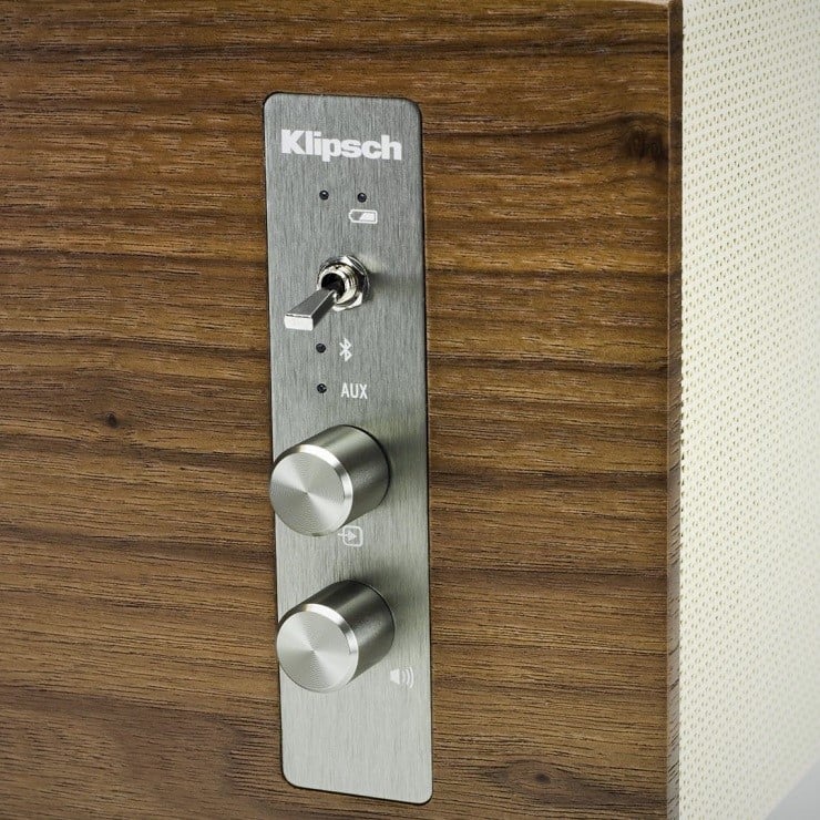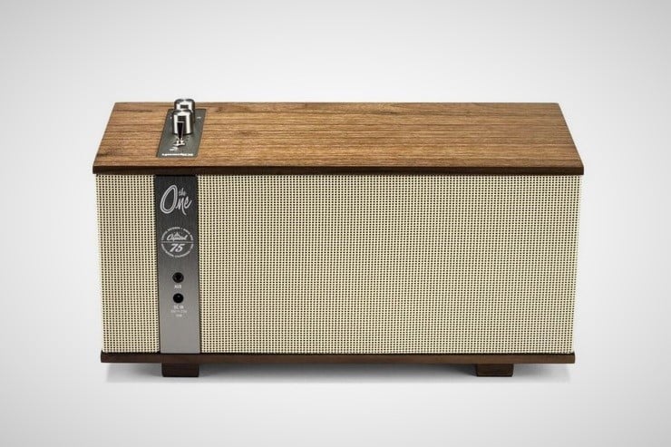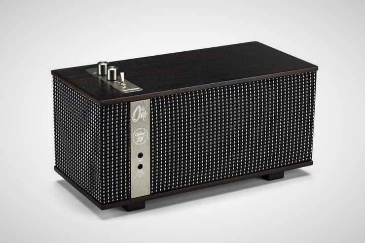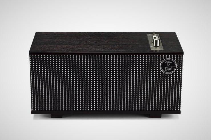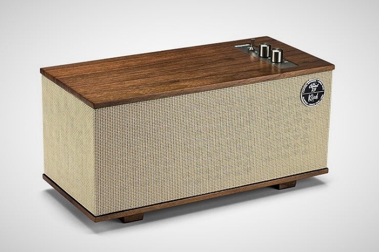 The Klipsch Capitol One Speaker ($300) incorporates real wood veneer and spun copper knobs and switches on this semi-portable tabletop system. The One sports 2 1/4″ full-range drivers coupled to a 4.5″ woofer that has been professionally tuned by Klipsch acousticians. As well as wireless Bluetooth connectivity, the speaker also has a 3.5mm analog audio input jack and runs on an 8-hour rechargeable battery.