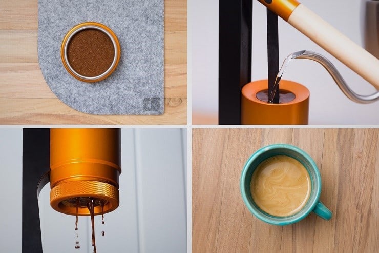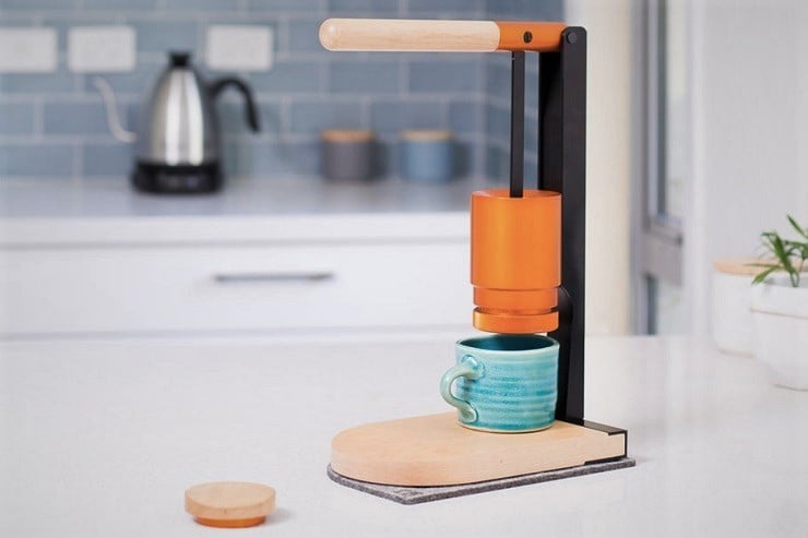 The Newton Espresso Press ($TBA) uses a powder-coated aluminum frame with anodized aluminum barrel and lever with clear-coated maple wood handle & base to create this manually operated, portable espresso press.  The 51mm filter basket holds between 14-19 grams of ground coffee depending on taste.  The lever is then manually pushed to drive the hot water through to make the espresso coffee.  With the press creating between 8-10 bars of pressure, it is as effective as any larger, electrically run espresso machines but weighs less than a travel-friendly 4.5 pounds.