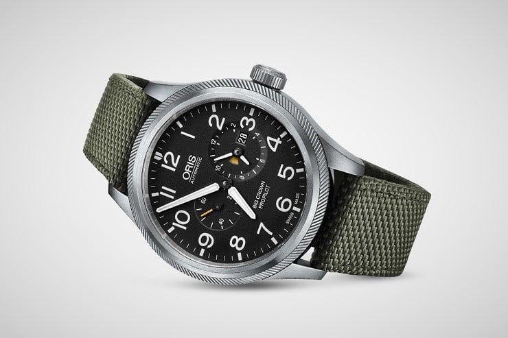 The Oris Big Crown ProPilot Worldtimer comes with the option of either a textile, leather, or crocodile strap, or a metal bracelet.  There is also the option of a black or gray dial.