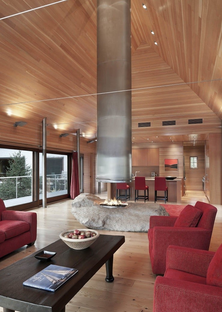 The primary unit sits atop pilings to extend over an existing salt pond. Its structural steel frame is anchored to the granite basin and lighter steel frames the large glazed windows that provide spectacular vistas of the coastline. This section also houses the communal spaces, kitchen and dining area with a granite open fire pit under a large vent. . The deck is cantilevered so that it appears to float out over the water. The other two units sit on the banks beside the salt pond and house the bedrooms while still providing a scenic view of both the ocean and the surrounding forest.