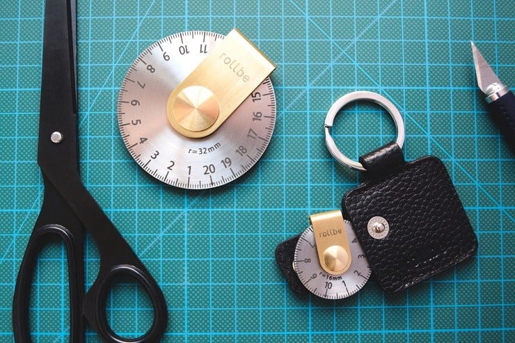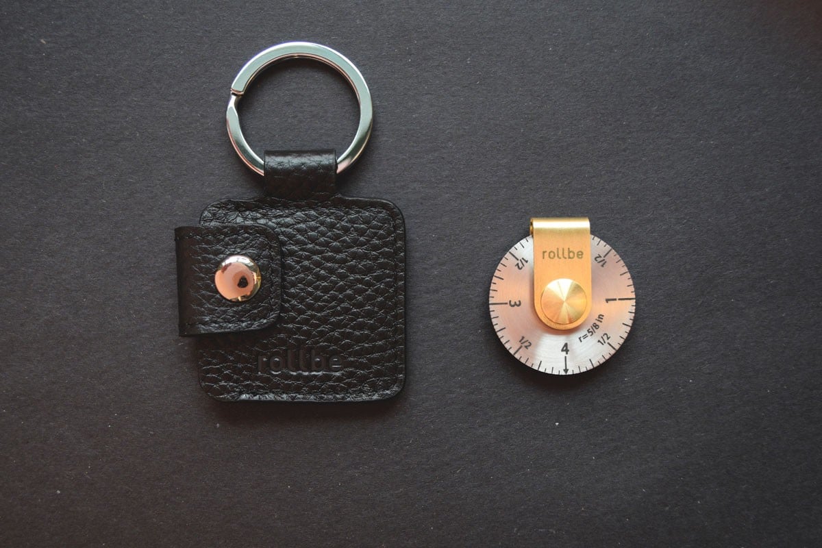 Rollbe comes in two sizes. The pocket version is 4″ in circumference with a 5/8″ radius and the large Rollbe is 8″ around and 1-1/4″ across. Both have laser engraved markings in both Metric and Imperial measurements and both come with a flat, fitted leather storage pouch. The edge of the Rollbe is knurled like a coin to eliminate slippage while measuring and provide safety & comfort for the hand. While it does require that little bit of math to add the revolutions for your result, the ease and convenience of the Rollbe will soon make it an indispensable favorite.