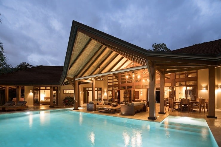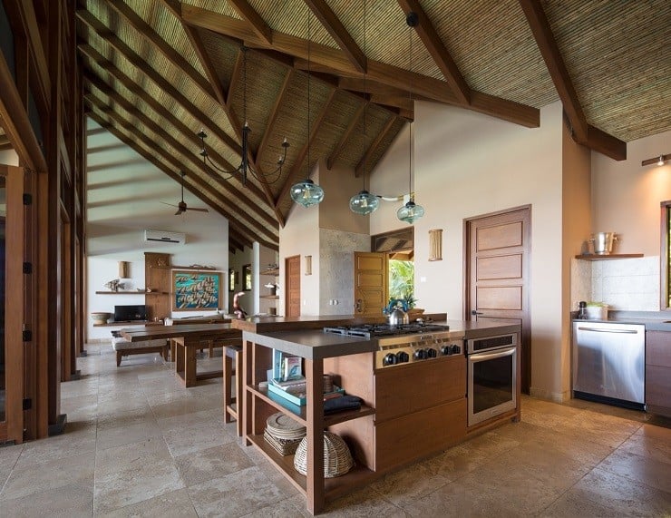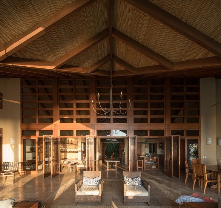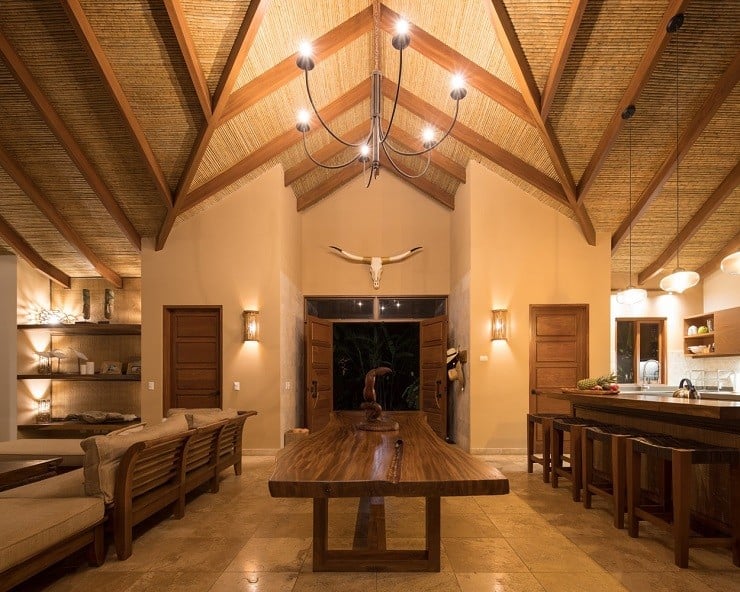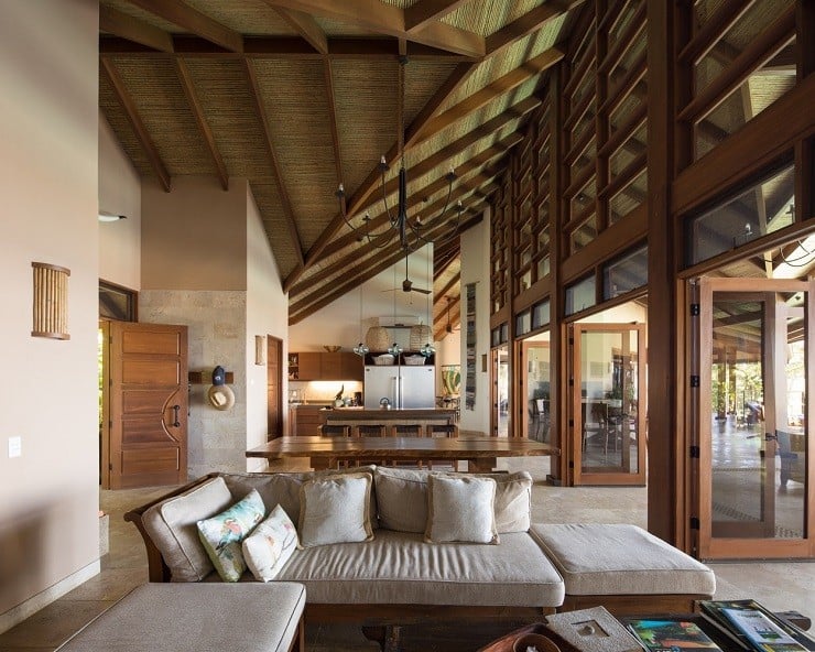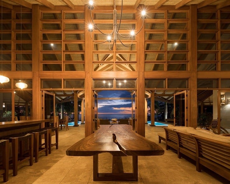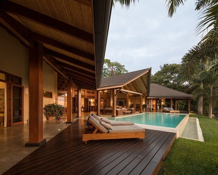 A fine example of this environmentally-friendly style can be seen in the Brisas del Cabo House in Malpais, Costa Rica. With the impetus being on a home that gave the appearance of living outside, the ceilings are high to provide both cross-breeze ventilation and natural air cooling against the hot climate. The curve of the long house is focused inward to the large swimming pool in the back and the lush vegetation beyond. Light wood and locally sourced materials help soften and blend the interior spaces through covered lounges and direct deck access to the water element tying the spacious and relaxing design together.