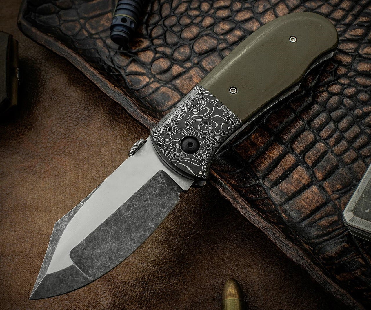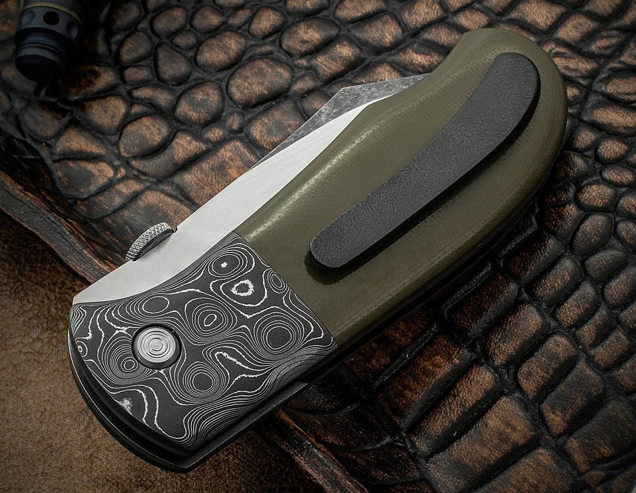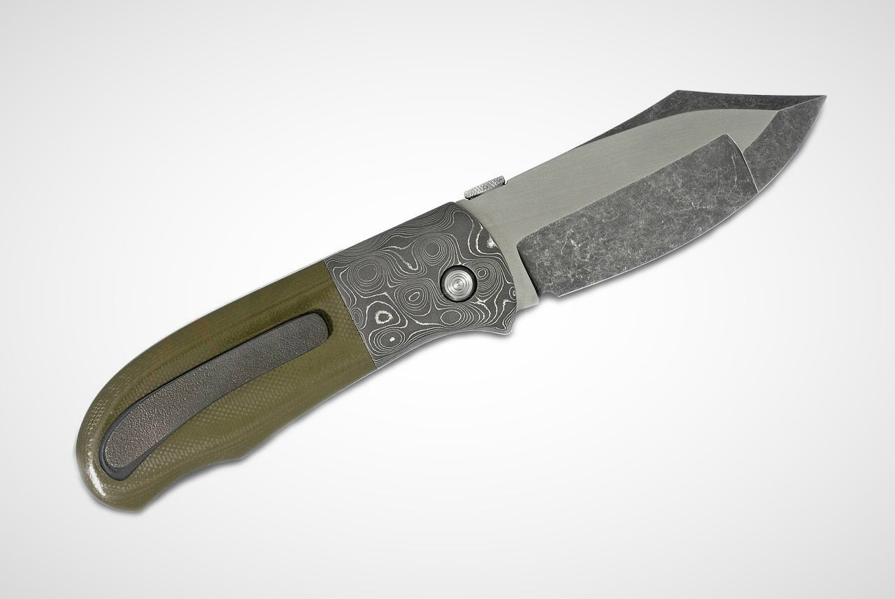 An excellent example of one of Chuck’s more straightforward EDC designs is this Custom Medium Puffin Folding Knife. The 3.125″ CPM-154 Stainless Steel reverse Tanto blade has a reinforced tip, a duplex blade grind, and a two-tone acid-washed finish. It features a titanium liner with liner lock and Teflon washers in the pivot assembly. The handle is polished OD Green G10 material with Nichols Raindrop Damascus Bolsters. It has a tip-up, right carry, Orange Peel Zirconium pocket clip and weighs a comfortable 5.3 ounces.