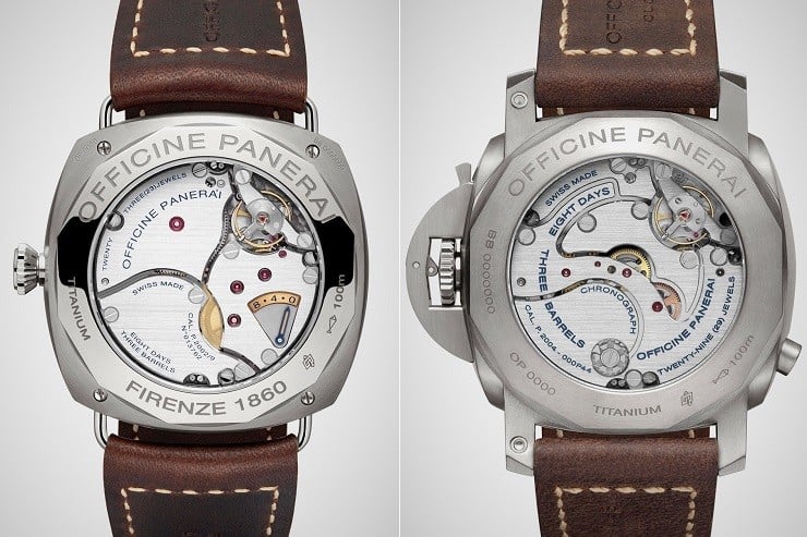 The Radiomir 8 Days Titanium ($12,100) has a 45mm case with magnified date window at 3 o’clock and a sub seconds dial at 9 o’clock.  It is powered by the hand-wound P.2002 8-Day Caliber movement with a clear crystal back to show it off and is water resistant to 100 meters.