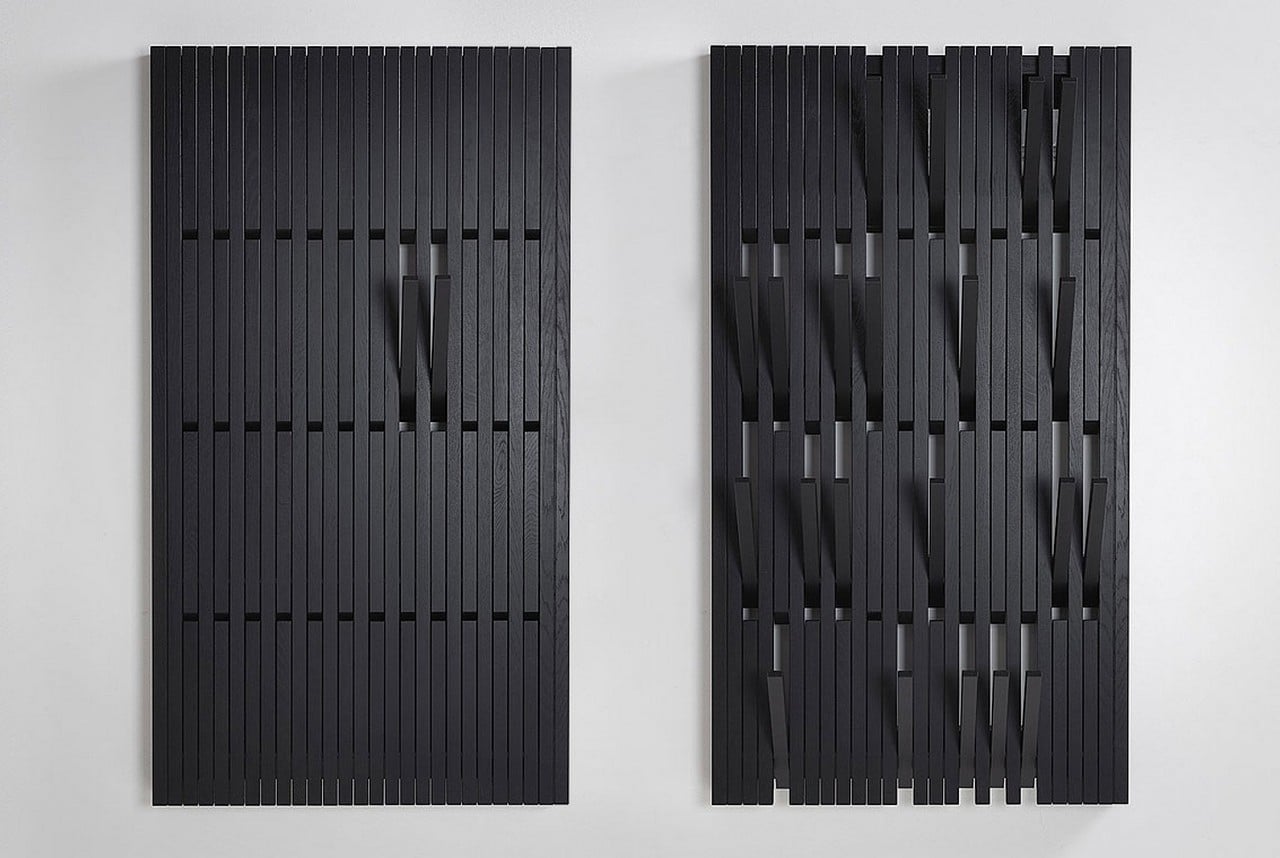 The Piano Coat Rack has four height levels for the hooks and comes in two widths. The smaller rack has a 20 hook option and the wider rack has 48 hook positions, each providing the option to be ‘played’ with like piano keys to customize their placement on the panel. The coat rack also offers four color options to fit your decor. As well as a simple black or white rack, there is also the choice of oak or walnut wood finish.