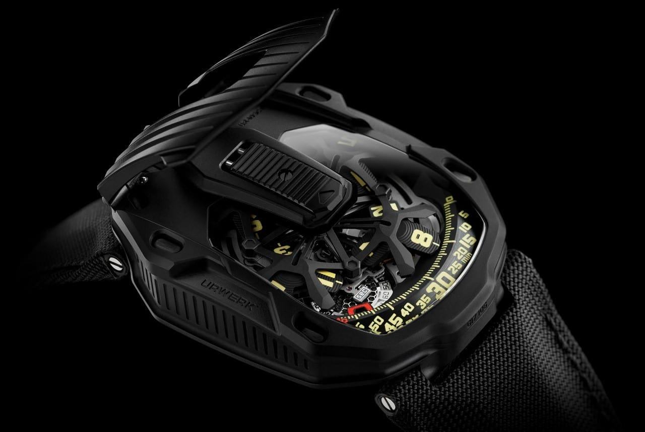 The Urwerk UR-105 CT Streamliner is available in two versions. Choice is between a full-gray titanium with mirror-polished steel and red accents or the titanium with black PVD coated steel with yellow accents around the dial. The strap also comes in either leather or textile on a pin-buckle.