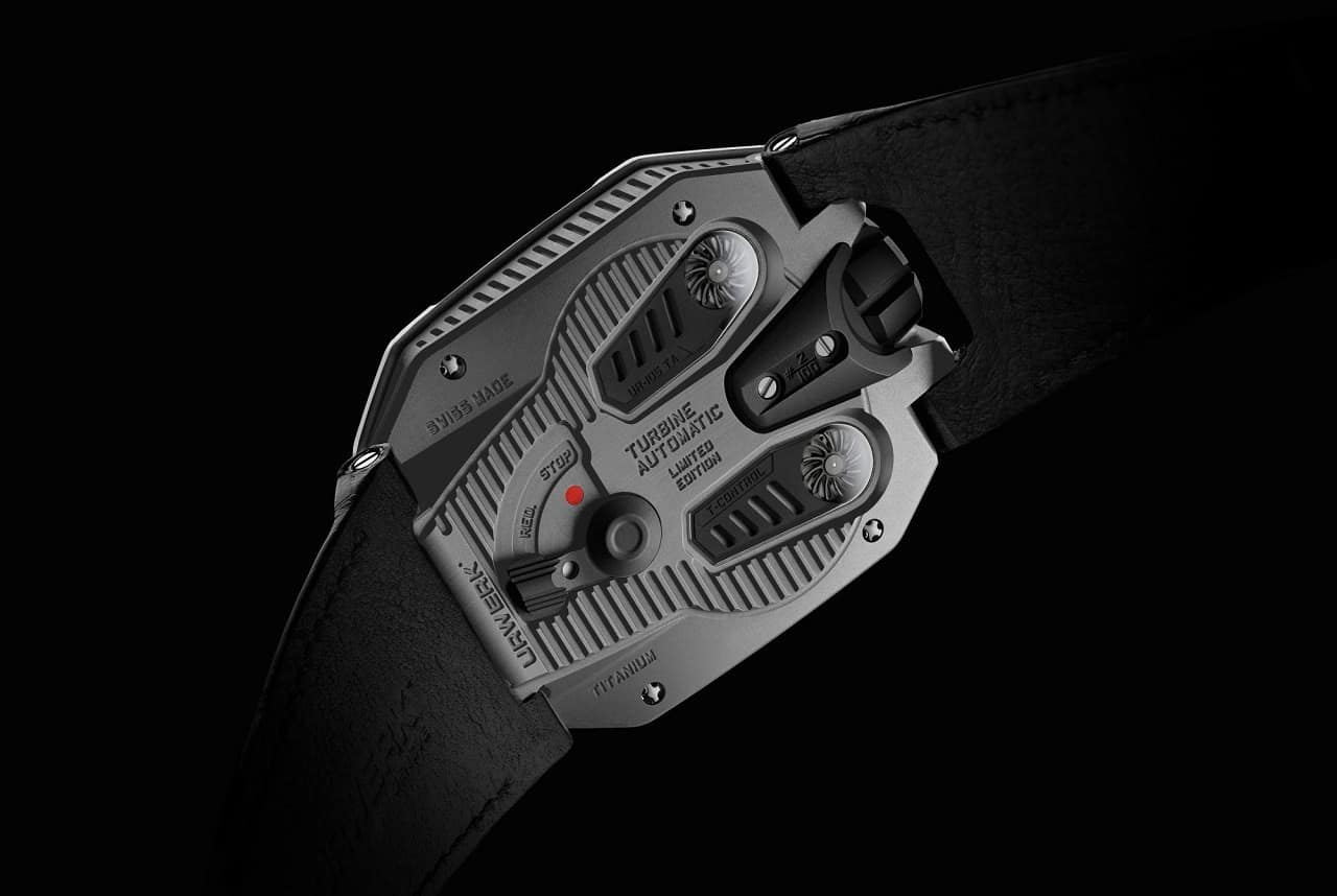 The time is displayed along a small curved band at the bottom of the dial and shows hours, minutes, digital seconds, and power reserve. In the center is a button that ‘opens the hood’ and lifts the cover back to display the inner workings of the satellite mechanism with its automatic 52 jewel caliber and twin turbines. The case is 39.5mm wide and, to fit the skyscrapers in, is 53mm long with a 17.3mm thickness.