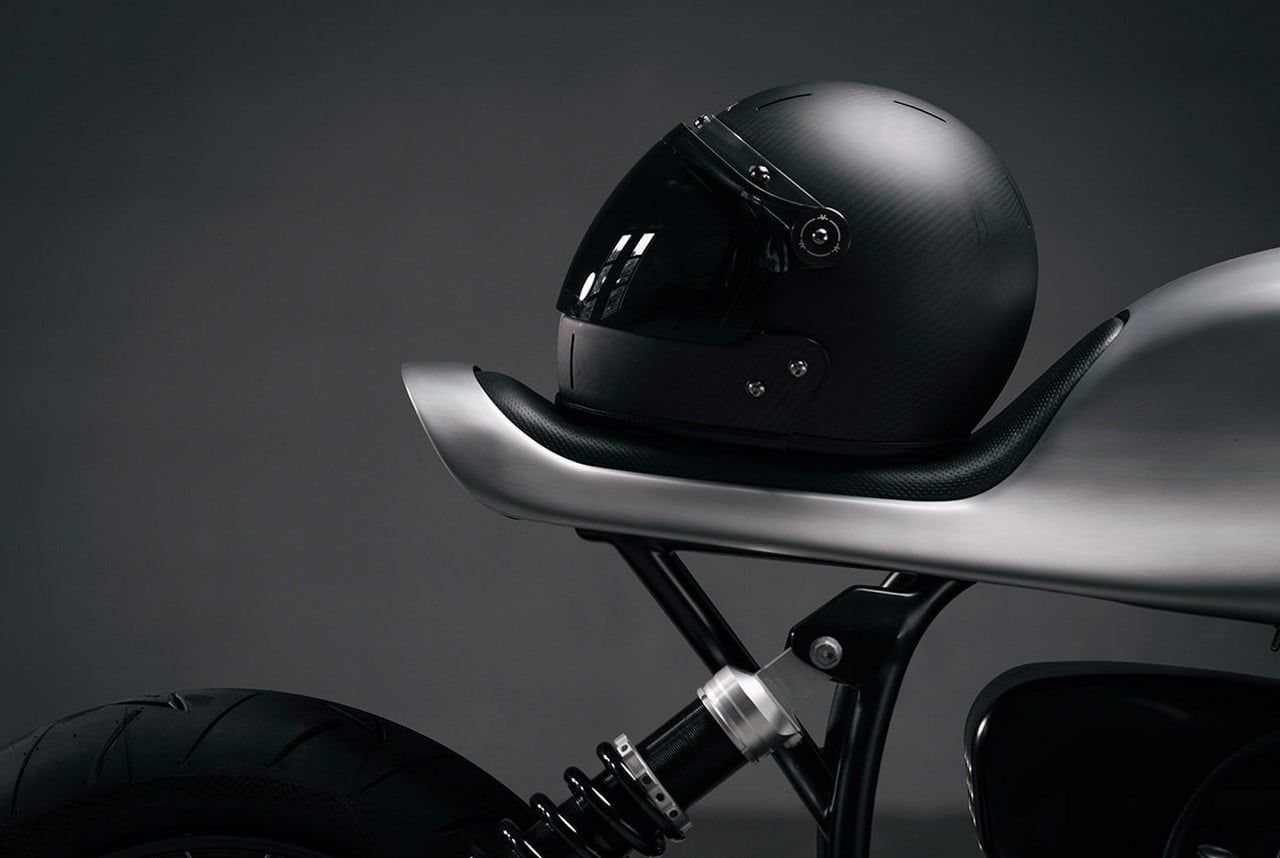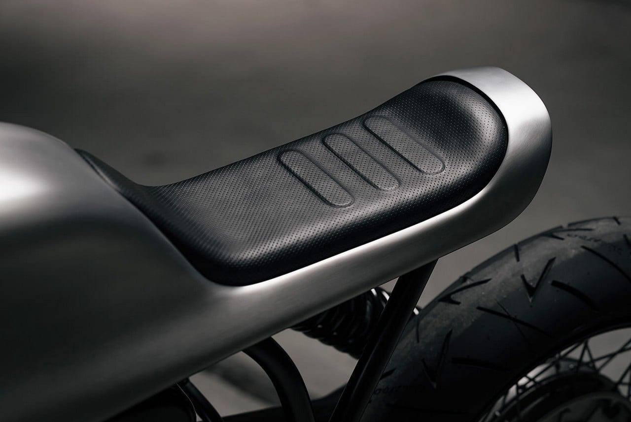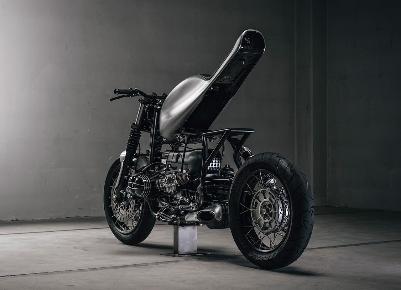 The original BMW battery was replaced by a smaller lithium-ion one and the airbox and ignition coil modified to match. They trimmed nearly 3″ off the front forks, replaced the original tank and seat with a hand-shaped monocoque unit, and added a new front mudguard and headlight nacelle, both made from aluminum. Another cool feature is the tail end of the body which lifts up via a gas shock-powered hinge, to reveal a custom-built subframe that houses a with a handsewn leather valet tray holding a stormproof lighter, a Leatherman multi-tool and matching card wallet. Finished up in ceramic-coated black, this stunning bike looks ready to rule the night.